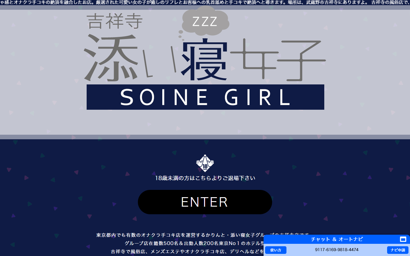 吉祥寺添い寝女子は「彼女」としての距離感を大切にする吉祥寺のデリヘル/手コキ・オナクラ店です。18歳〜20代の女性が密着や焦らしを中心にオイルマッサージを組み合わせ、安価な45分コースから癒しとドキドキを提供。サイトでは詳細な女の子プロフィールや体験動画を多数公開しており、気軽に予約できる点が魅力です。