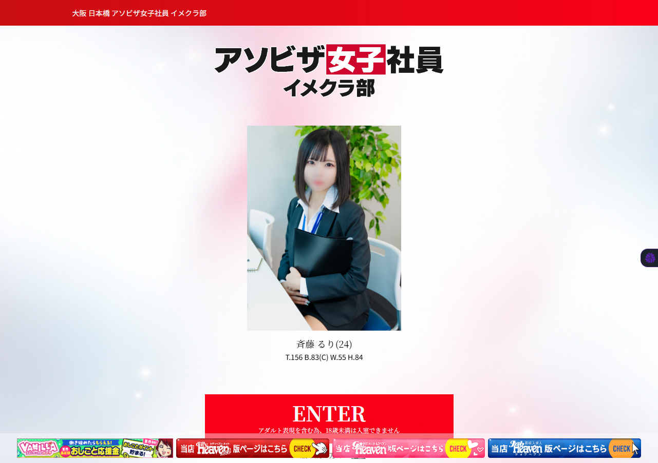 アソビザ女子社員 イメクラ部は、日本橋にあるホテヘル/イメクラ・コスプレ店です。女子社員という設定で演出性の高いサービスを提供し、多彩な在籍女性のプロフィールや動画・写メ日記などのコンテンツで利用前に雰囲気を確認できます。各種割引プランやコースがあり、60分の料金目安やアクセス(日本橋駅徒歩2分、電話予約可)も案内されています。