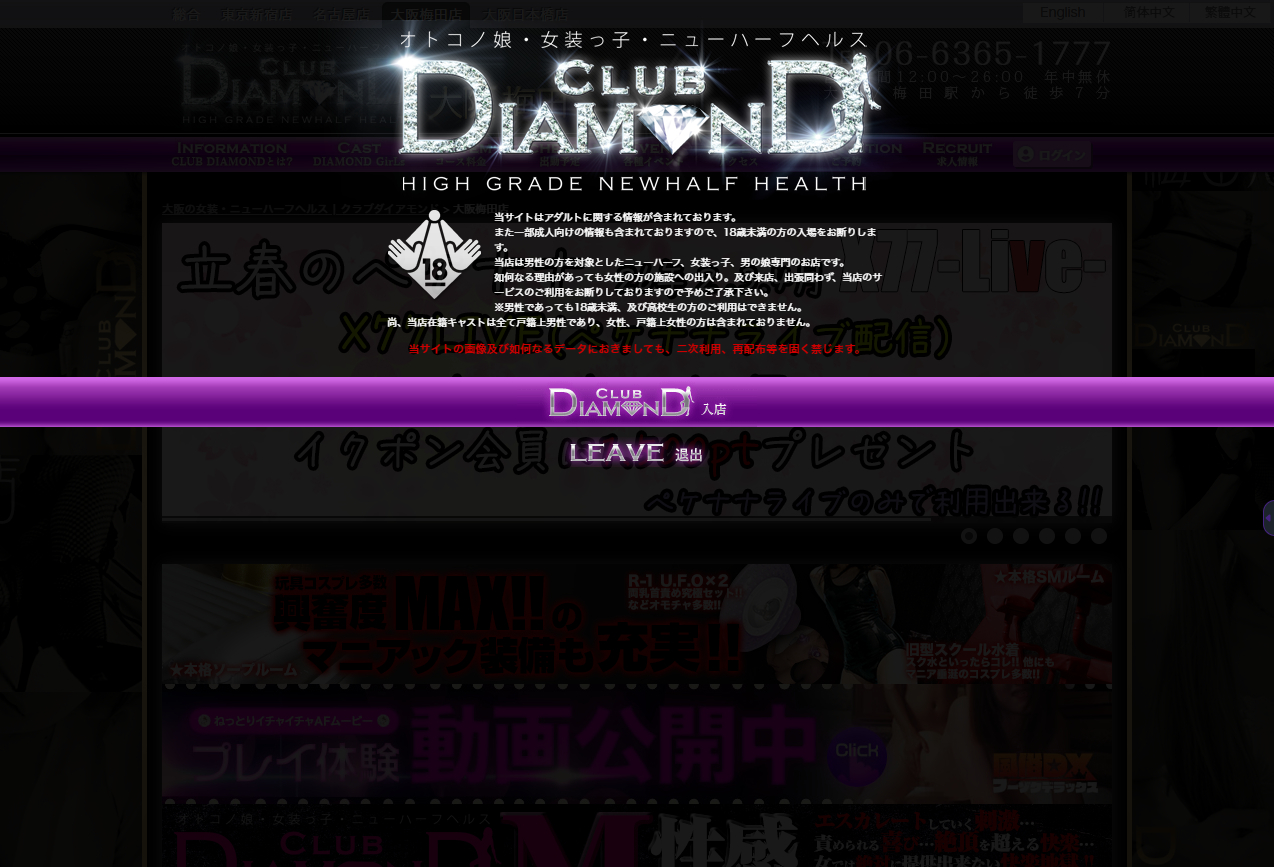 大阪・梅田にある店舗型ニューハーフヘルス「Club DIAMOND 大阪梅田」は、幅広い性癖や欲求を受け入れ、新しい快感と高い満足感を提供します。公式サイトで在籍スタッフのプロフィールや体験動画、写真ギャラリーを豊富に掲載し、60分13,000円〜の明瞭な料金設定や昼割などの割引情報も案内しています。梅田駅からアクセスしやすい北区兎我野町のビル6Fに店舗を構えています。