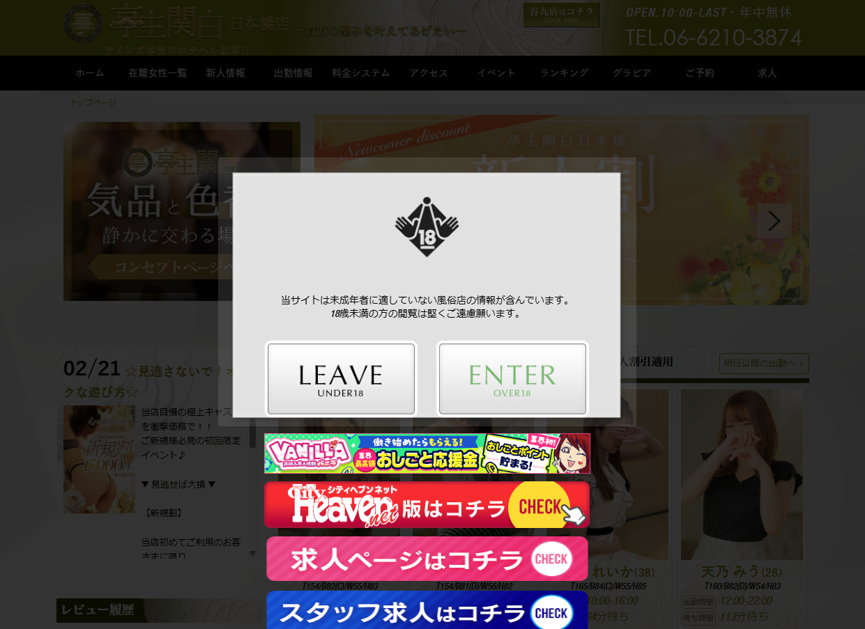 亭主関白 日本橋店は地下鉄日本橋駅徒歩3分、10:00~24:00営業のホテヘルです。60分13,500円~の明瞭料金に加え、新規割・新人割などお得なクーポンあり。クレジット決済対応、領収書発行可。熟女・人妻系中心の豊富なキャストと動画・写メ日記で雰囲気を確認してから予約できます。お問い合わせは06-6210-3874まで。