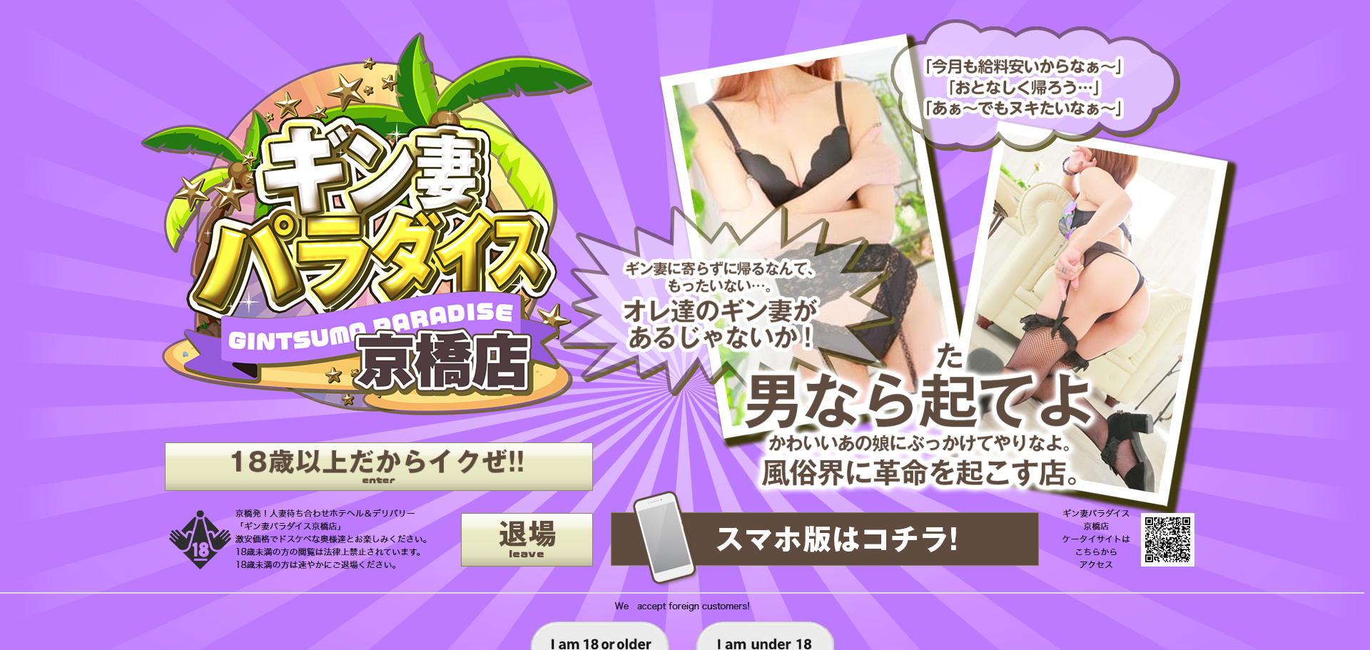 ギン妻パラダイス京橋店は京橋発の人妻・熟女系デリヘルで、年中無休・10:00~6:00で営業しています。当日出勤情報や各キャストのサイズ・出勤時間を掲載し、待ち合わせ・デリバリー対応の複数コース(70分7,999円〜など)を用意。交通費はエリア別に設定され、指名料・延長料・オプションの有無など料金体系を明示しています。クレジット決済に対応し、グループ店舗の案内や動画・グラビアなどのコンテンツも公開しています。